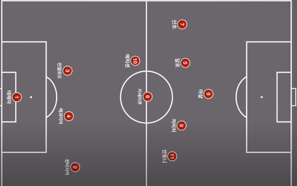 그래서 에릭센이 후방으로 내려와서 에릭센이 볼을 받은 다음에 앞쪽으로 그냥 패스를 건네주는...... 그래서 이게 사실 궁여지책으로 나온 전략이었는데, 이렇게 되면 또 에릭센이 수비적인 부분이 부족하다 보니까, 카세미로까지 올라가면 에릭센이 수비를 할 때 문제가 생기죠. 그래서 여기서도 이제 문제가 많이 나오게 됩니다. 이제 빌드업이 너무 안 되니까, 그냥 에릭센이 내려가고요. 카세미르와 자비처는 올라갑니다. 에릭센이 볼을 받아서 앞으로 그냥 롱패스를 뿌려줘라 이런 전략까지 나왔어요.