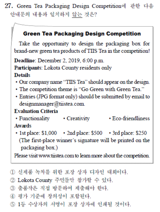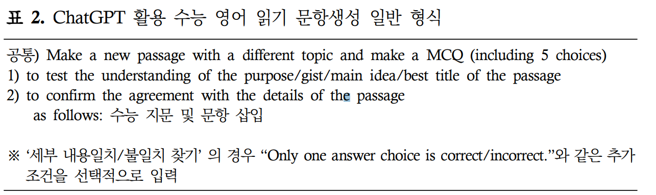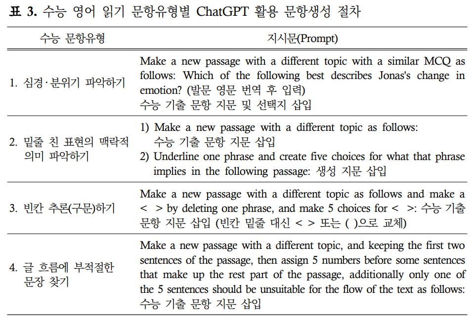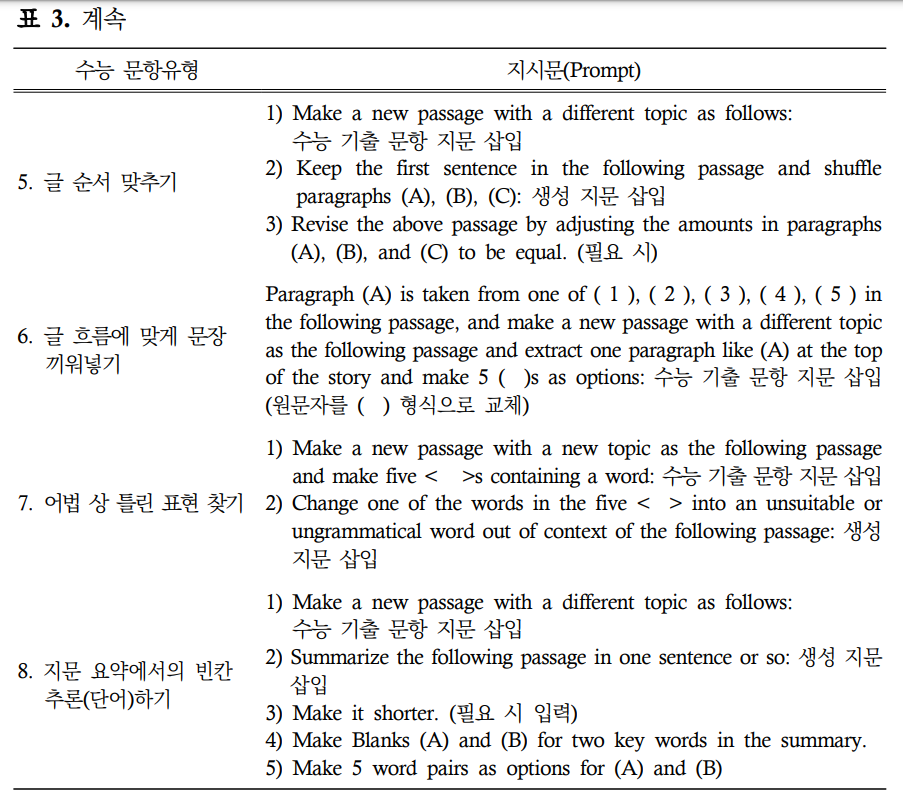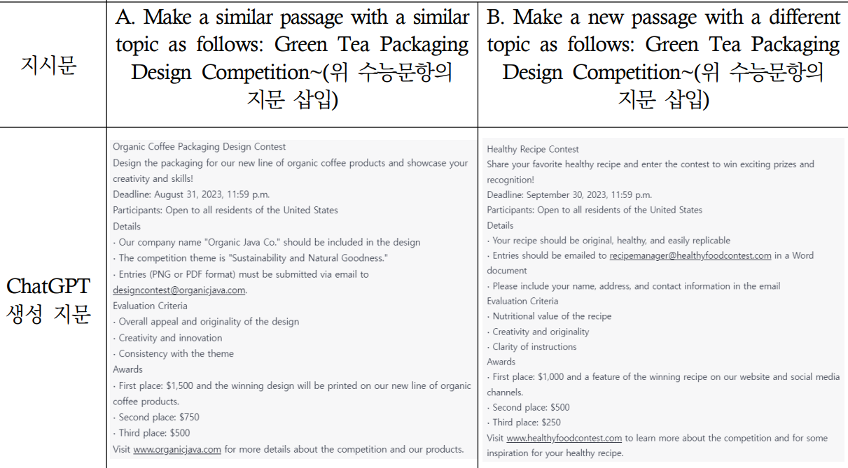 ‘세부 내용일치/불일치 찾기’ 유형의 경우에는 추가적으로 “Only one answer choice is correct/incorrect.”와 같은 조건을 입력해야 원하는 형식의 선택지 구성이 가능하였다.하지만 문항유형, 특히 선택지의 구성이 지문의 특성과 밀접하게 연계되어 있는 경우에는 문항별로 차별화된 지시문이 필요하였다.
