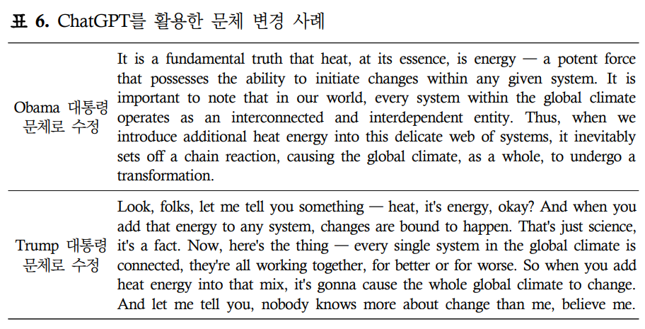 표 5의 원본을 미국의 Obama 대통령과 Trump 대통령의 문체로 수정한 사례이다. 유명인의 글이나 연설 등의 데이터는 이미 ChatGPT의 개발에 사용된 언어모델인 GPT-3.5에 포함되어 있기 때문에 이러한 특정인의 문체로도 변경도 가능하다. Obama 대통령의 경우 격식있고 고급스런 단어를 구사하는 반면 Trump 대통령의 문체는 비격식의 구어체, 보다 직설적이라는 것을 알 수 있다.