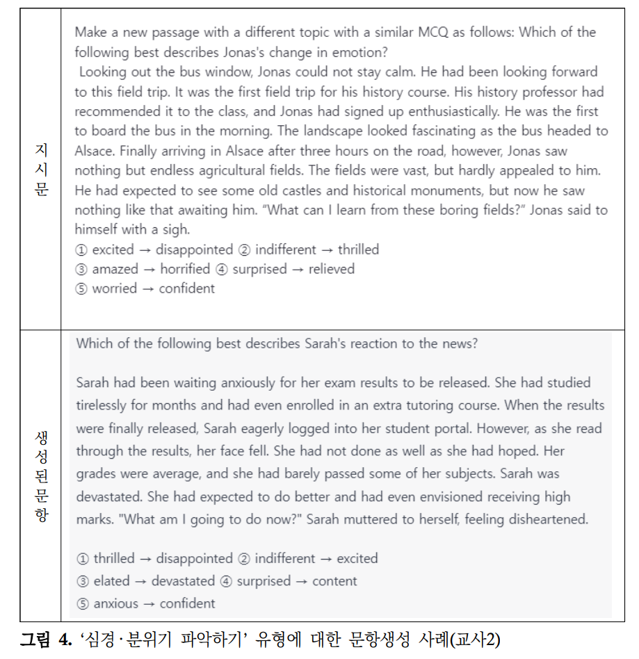 예를 들어, 등장인물의 심경 또는 분위기를 파악하는 문항은 2017학년도 수능부터 하나의 감정이나 분위기를 묻는 문항에서 심경의 변화를 묻는 문항으로 고정적으로 출제되고 있다. 이 문항의 경우 지문생성 단계에서부터 두 가지 심경이 제시되도록 조건화되고 선택지의 구성 또한 기출 문항의 형식을 따라야 하기 때문에 표 2의 첫 번째 지시문과 같이 수능 기출 문항의 발문을 영문으로 번역한 후 예시 문항에서 이를 대체하여 다음의 그림 4와 같이 문항생성을 시도하였다