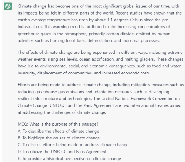 “Make a new passage about recent ‘climate change’ and make a MCQ (including 5 choices) to test the understanding of the purpose of the passage
