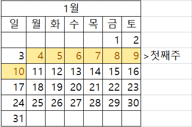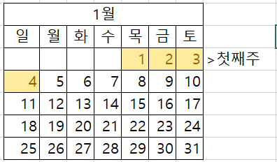매 달의 1일이 월, 화, 수, 목 하나여야 첫쨰주로 인정을 받는다는것...!