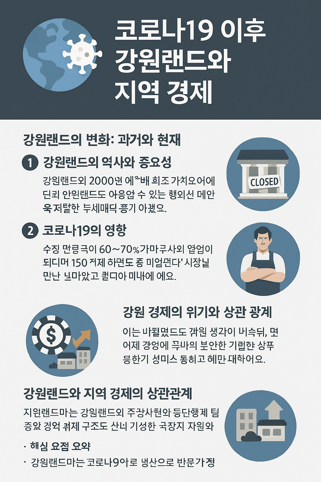 🔄 강원랜드는 코로나 이후 많은 변화를 겪었어요. 예전처럼 활기차던 모습은 많이 사라지고, 지금은 조용하고 많은 가게들이 문을 닫은 상태예요. 이런 상황 때문에 지역 경제도 큰 어려움을 겪고 있답니다. 앞으로 강원랜드가 다시 활기를 되찾고 지역 경제가 회복되려면, 지역 주민과 업주, 그리고 강원랜드가 함께 힘을 모아야 할 때예요.